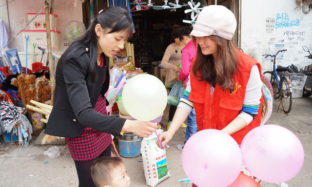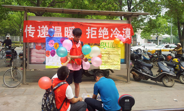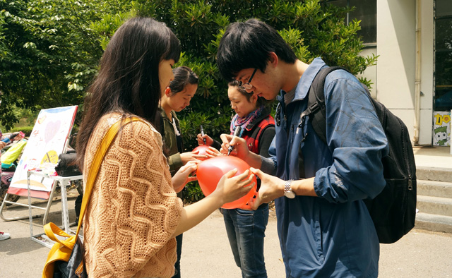 上午8点,全体人员在校门口全数集合,活动正式开始。本次主题活动共分为两个部分。首先,由青协部员在公司内收集各级员工们对他人的关爱物语,并将它们写在气球上;其次,由青协部员将这些温暖的祝福分发给社会各界的人民群众,代表公司用积极行动去温暖他人。部员共分为两组,一组去浦口区苏果购物中心,另一组则到浦口区蔬菜批发超市。活动气氛分外高涨,广大市民也积极参与其中,人们在欢声笑语中感受彼此最真挚的祝愿。同时公司青协巧遇南审青协举办雅安慈善捐款活动,在彼此合影留念中共同感受同学们的情真意切。