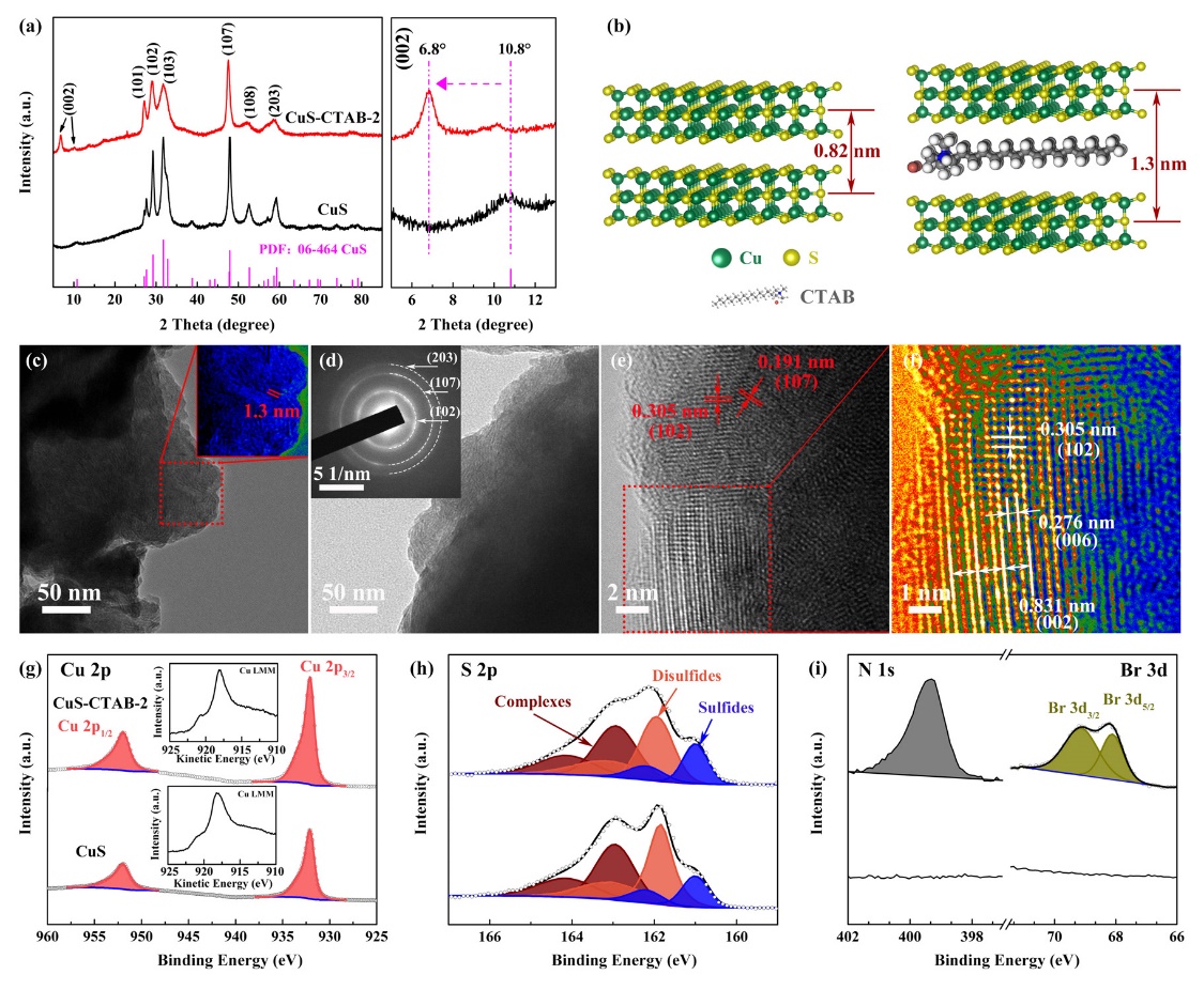 可充电镁电池具有丰富的材料资源、高体积比容量、无枝晶镁金属负极以及多电子氧化还原反应等优点,有望成为高比能、高安全性的未来电池。然而,多价Mg2+与正极材料中阴离子之间的强库仑作用、电极/电解质相容性差等问题阻碍了镁电池的发展。沈晓冬教授团队新型电池研究组赵相玉研究员等以具有高理论容量的CuS正极材料为研究对象,针对其可逆容量低、反应产物易脱溶等问题,通过卤化物插层提升镁离子在正极材料中的迁移和采用相容性好的电解液等策略,发展了高比能可充电镁电池。该CuS正极具有突出的储镁能力(在50 mA/g的电流密度下可逆放电容量高达477 mAh/g,质量能量密度为415 Wh/kg),显著高于现有报道的金属氧化物、金属硫族化合物及聚阴离子化合物等镁电池正极。此外,其在1C的高倍率下(560 mA/g)经过1000次的深度循环后,仍表现出优异的可逆稳定性。本工作为发展高性能可充电镁电池及其它多价离子电池(如Zn2+、Ca2+、Al3+)的正极材料提供了新的思路。相关研究得到了国家自然科学基金、江苏高校优势团队建设工程、江苏先进无机功能复合材料协同创新中心和江苏高校青蓝工程的资助。论文第一作者为硕士生沈寅麟。