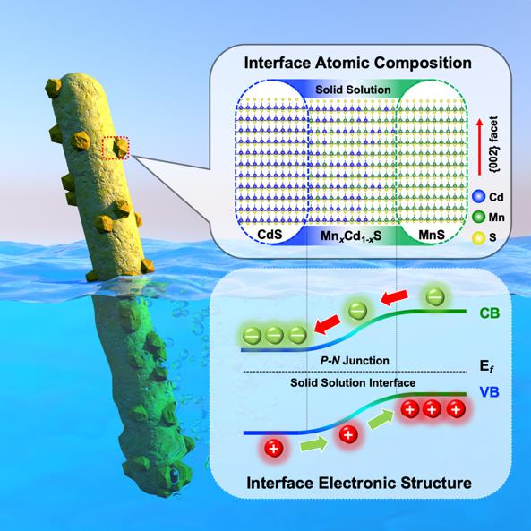 为了改良异质结构筑策略的这一缺陷,公司许仲梓、陆春华教授团队与澳大利亚昆士兰大学王连洲教授团队合作,报道了一种具有MnxCd1-xS固溶界面的新型“孪生结”光催化剂。材料中的梯度固溶体界面构成了缓变型p-n结,为电荷分离和转移提供了有利的内建电场和顺畅的传输通道。该“孪生结”光催化剂无需任何助催化剂,即可获得的高达82.4 μmol h-1的制氢速率,约为原始CdS的48倍,400 nm下的表观量子产率超过10%。该“孪生结”光催化剂的设计理念为新型光催化剂的合理构建提供了新思路和新方法。相关研究成果日前以题为“Design of Twin Junction with Solid Solution Interface for Efficient Photocatalytic H2 Production”刊登于纳米和能源材料领域国际期刊《Nano Energy》,论文第一作者为公司黄亨明博士,通讯作者为公司陆春华、寇佳慧教授与澳大利亚昆士兰大学王连洲教授。相关研究得到了国家自然科学基金、江苏高校优势团队建设工程、江苏先进无机功能复合材料协同创新中心和江苏高校青蓝工程等的资助。