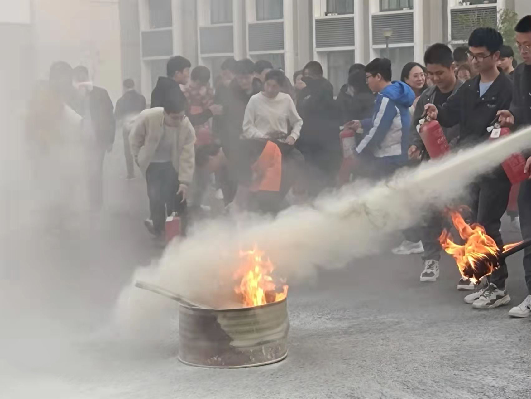 会议结束后,楼内消防警报拉响,进行了消防应急疏散演习,全院师生用毛巾捂鼻快速从楼梯有序下楼,疏散到公司楼前广场。保卫处刘世伟老师组织大家进行了消防知识有奖竞答,并就灭火器的正确使用方法进行了演示,在消防科老师的指导下公司师生分组进行了实际灭火演练。