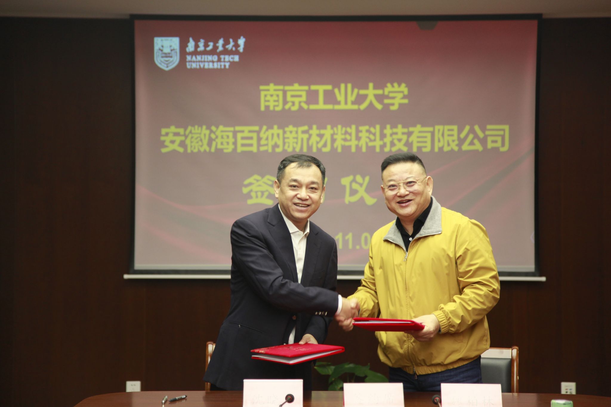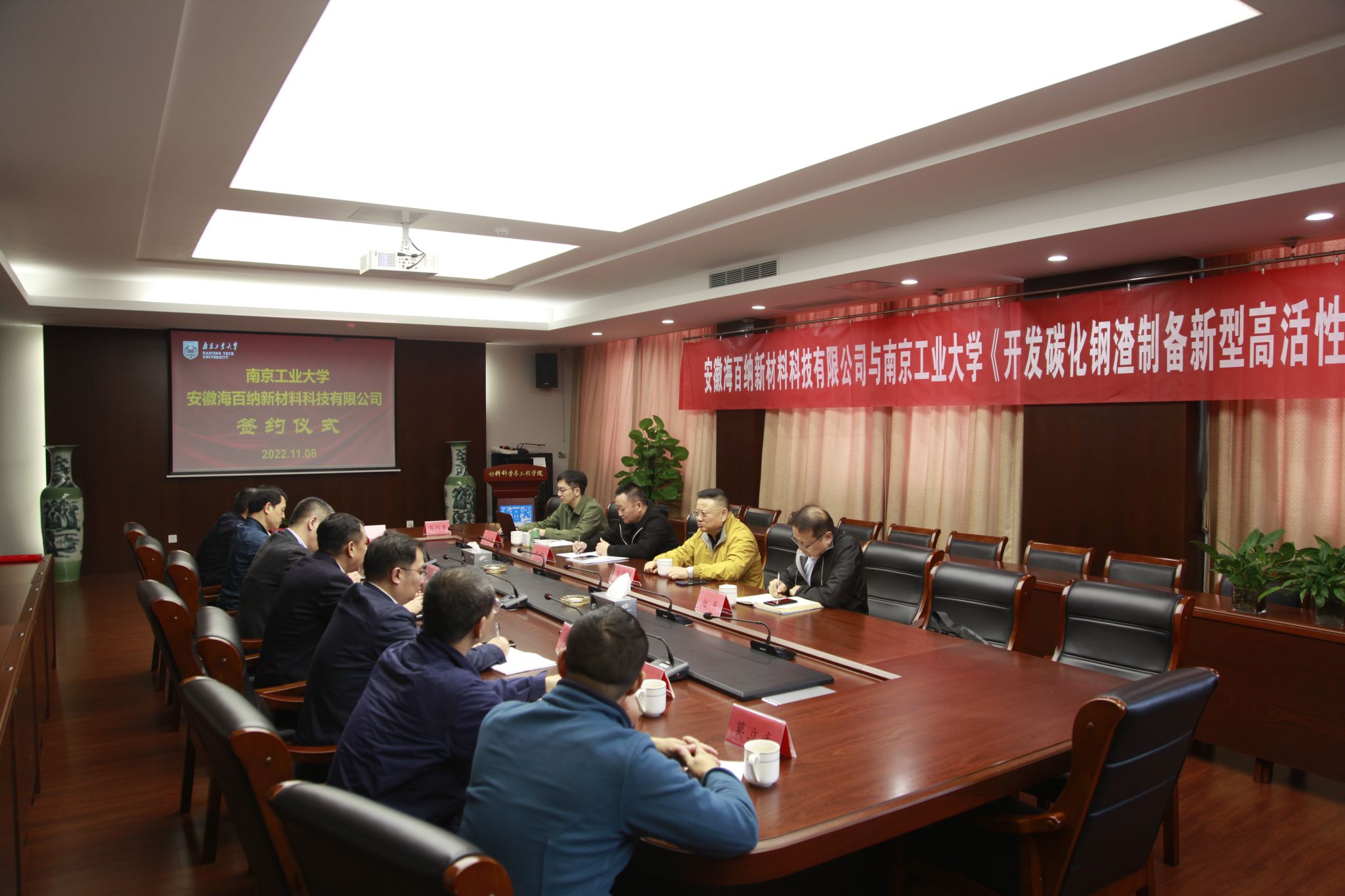 11月8日上午,安徽海百纳新材料科技有限公司董事长魏柏林等一行4人来公司访问交流,并举行合作签约仪式。材料公司党委书记高树军、项目负责人沈晓冬教授等公司领导和老师参加会议。