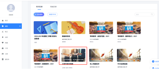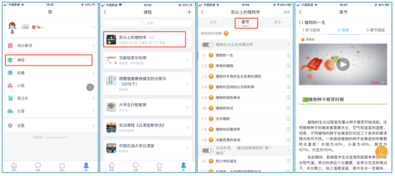 点击底部菜单“我”—“课程”,可进入课程列表,再选择要学习的课程,即可进入课程详情,章节内容即为学习内容,在章节学习过程中可随时写笔记。