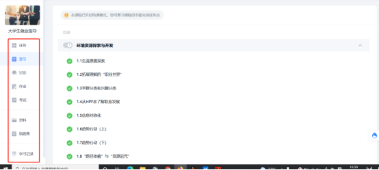 进入课程后,可查看章节列表的知识点,左侧为学习导航,可即时收到老师发布的学习任务、测验、作业及考试,查看自己的学习进度,并进行资料中的拓展学习,也可参与讨论、提问等。