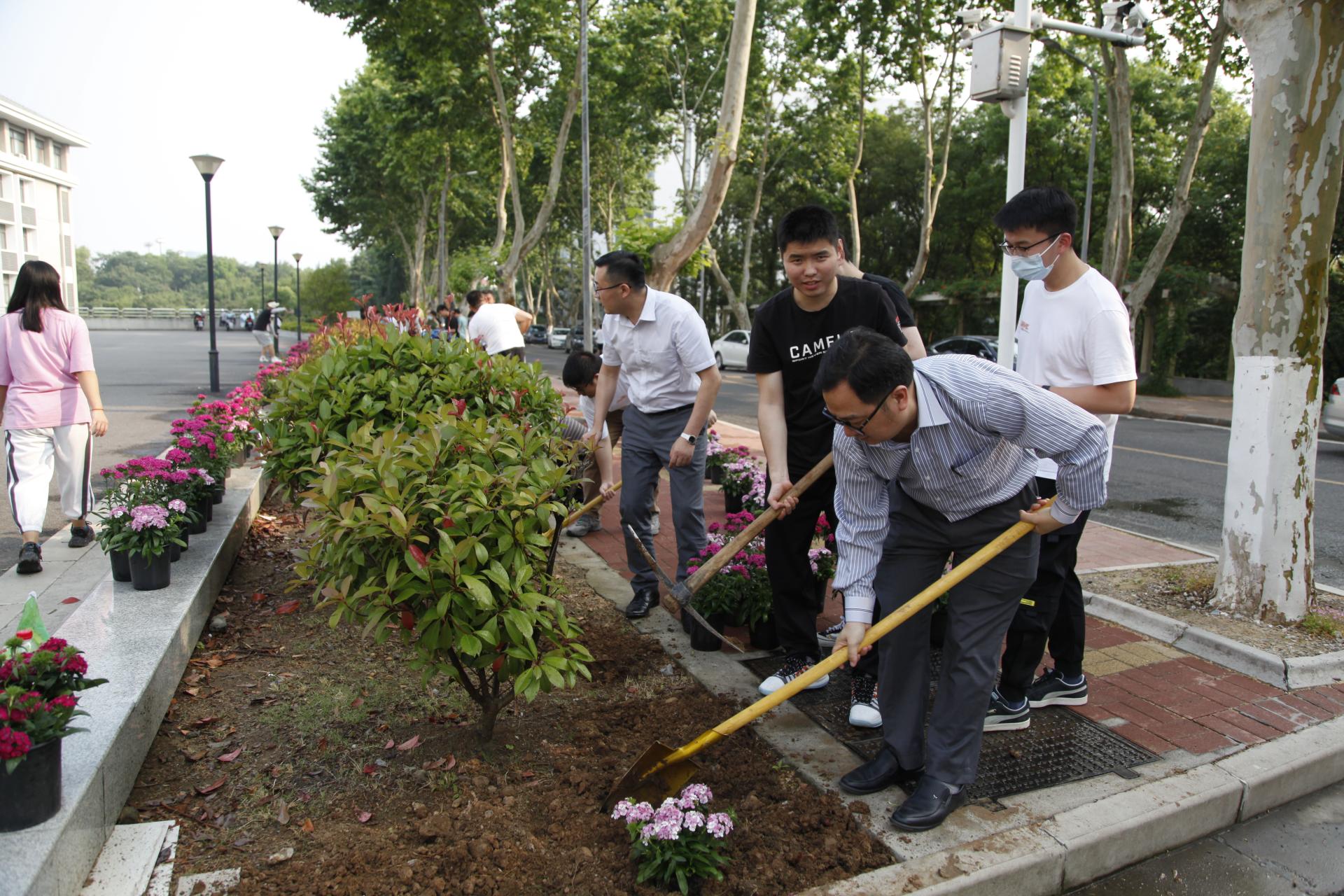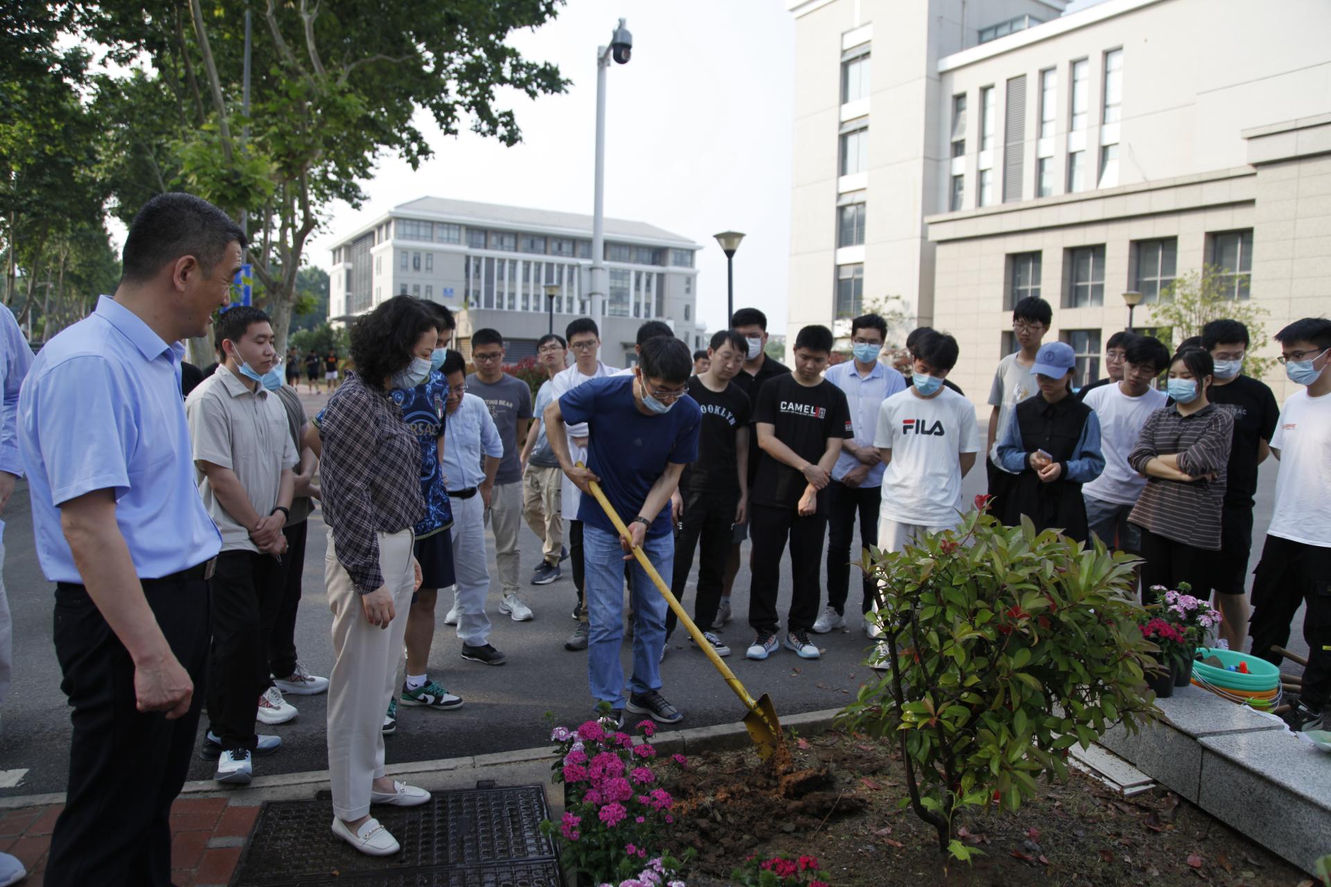 后勤保障处运行监督管理办公室方莉、孙自浩老师为师生示范栽种方法,全体师生党员热情高涨、分工协作,挥锄挖土、放苗培土、踩压夯实、提水浇灌,每个环节都有条不紊。大家有说有笑,密切配合,干得热火朝天。