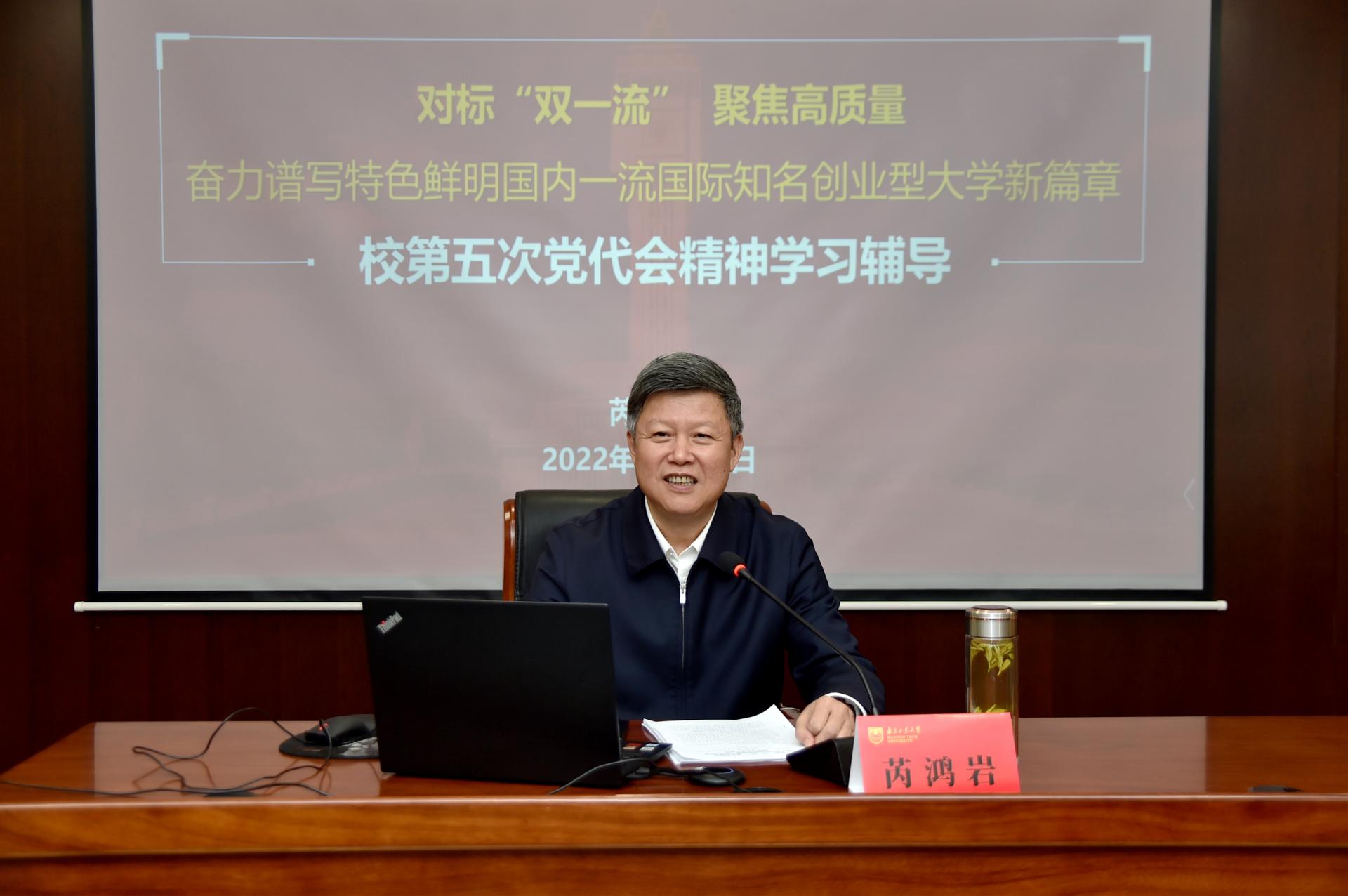 芮鸿岩书记围绕大会主题介绍了校第五次党代会召开的背景意义、筹备和召开情况,从工作回顾、奋斗目标、主要任务、党的建设四个方面对党委工作报告进行了详细解读。他指出,经过全体师生多年的共同努力,公司党的建设全面加强,创业型大学建设成效显著,办学水平和综合实力持续提高,社会影响力和美誉度不断提升。芮书记结合大会确立的“特色鲜明国内一流国际知名创业型大学”战略目标、任务要求、思路举措进行了深刻阐述。他强调,一分部署、九分落实,蓝图已经绘就,关键要狠抓落实,真抓实干。各单位各部门要认真学习宣传贯彻公司第五次党代会精神,认真制定方案,精心组织实施,逐项细化重点任务,对标“双一流”,聚焦高质量,奋力谱写特色鲜明国内一流国际知名创业型大学新篇章。