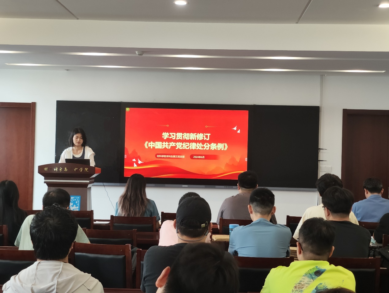 活动伊始,支部宣传委员、毕业班党员代表周颖同志以《中国共产党纪律处分条例》为引,带领全体党员深入学习了党的纪律要求。她强调,作为一名共产党员,必须筑牢清正廉洁的思想根基,培养廉洁自律的道德操守,弘扬崇廉拒腐的社会风尚。在即将踏入社会的新征程中,毕业生党员们更要时刻保持清醒的头脑,坚定信仰,牢记使命,以实际行动践行党的宗旨。