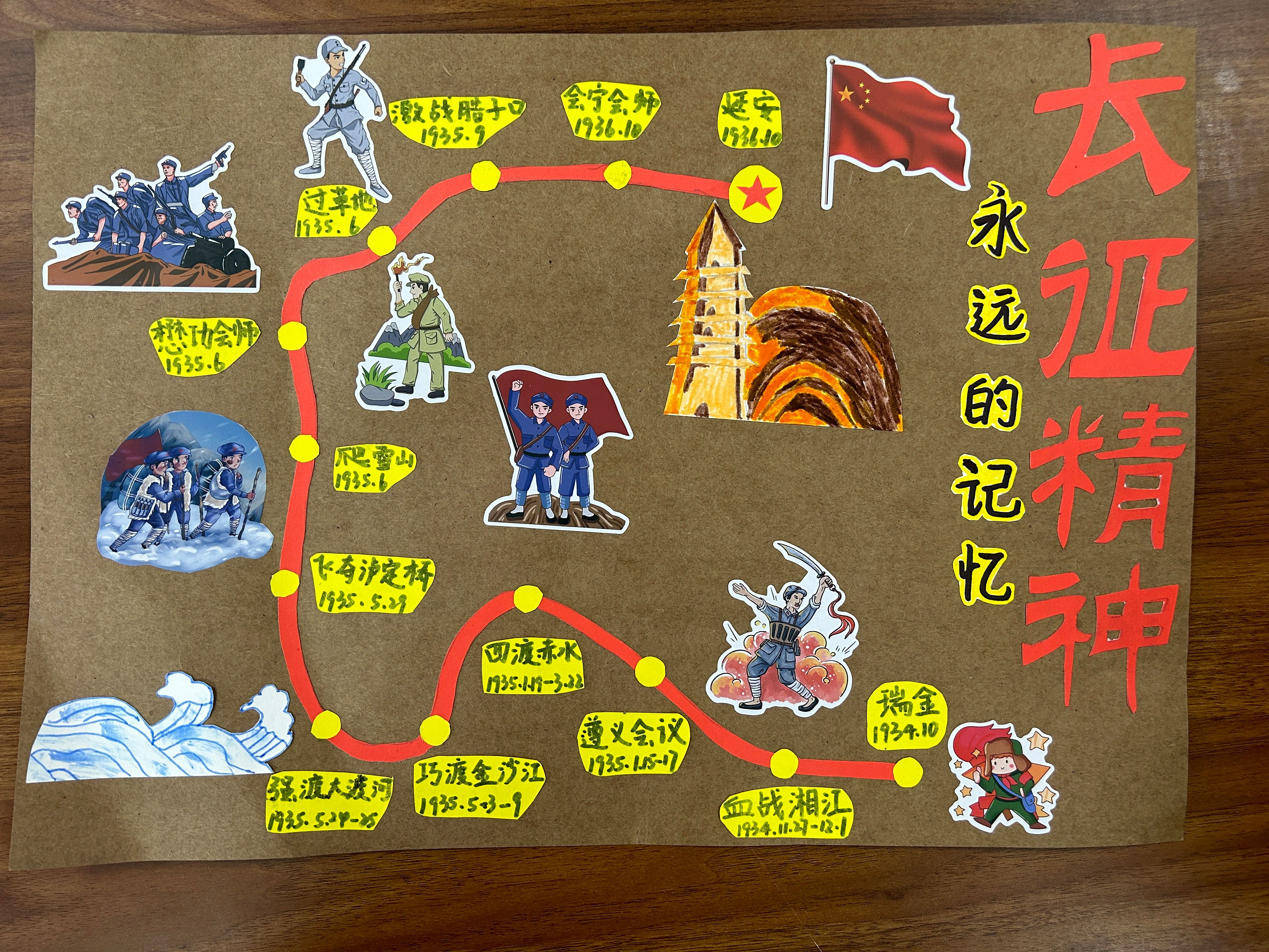 活动开始前,各位党员们分别收集每个长征点的信息。在收集的过程中更深刻地了解长征故事。从起点瑞金到终点延安,期间共经过14个省,翻越18座大山,跨过24条大河,走过荒草地,翻过雪山,最终与陕北红军胜利会师。漫漫征途中的历史故事让党员们深受感动,也更加坚定了传承红色基因的决心。通过接力,党员们以绘画和书写的方式构建起一幅完整的红军长征图谱,反映这一伟大的英雄史诗。长征图概括了红军长征的路线方针,突出了红军长征中的重要战略活动。