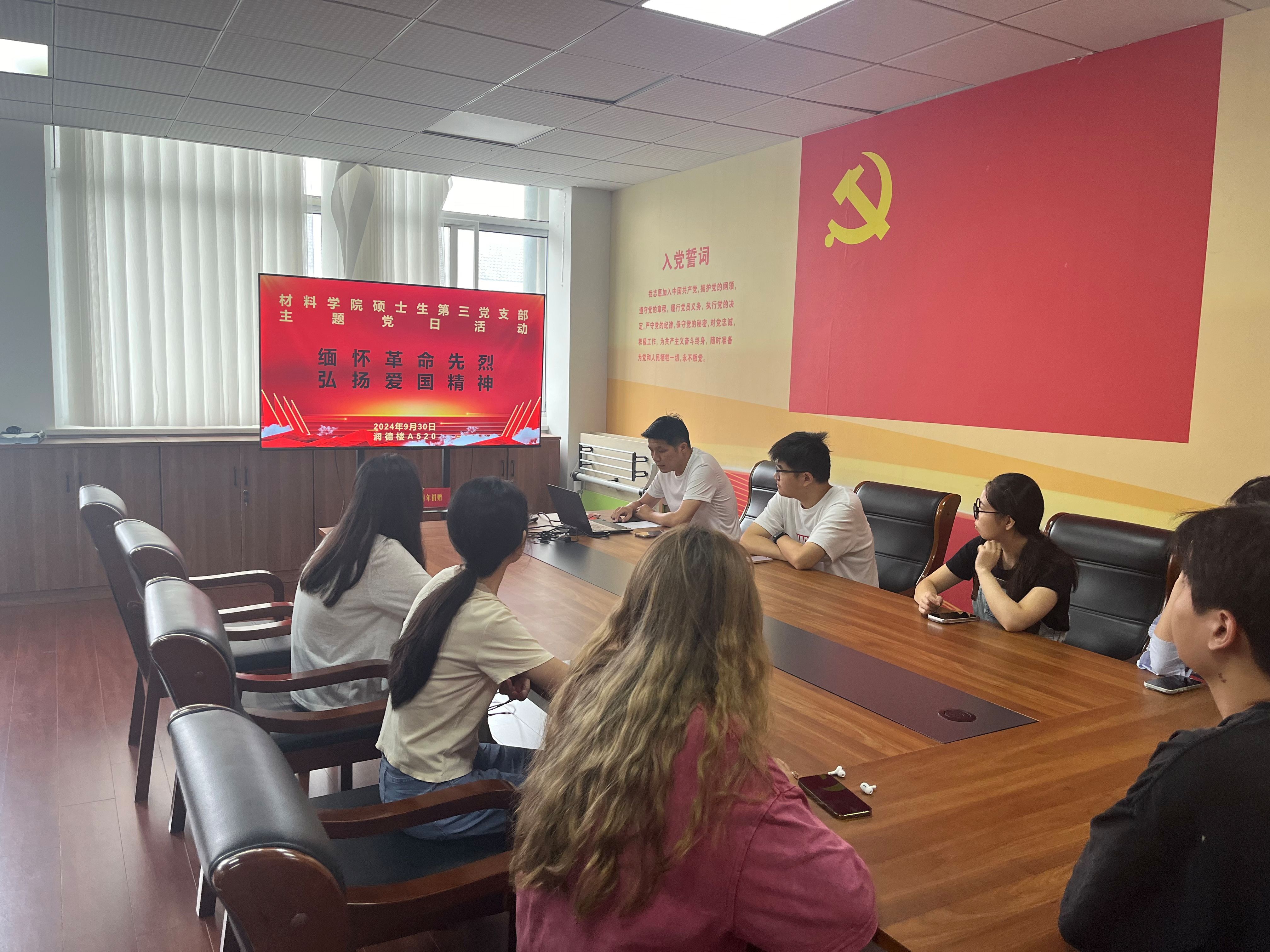 鲜花献英烈,浩气壮山河。2024年9月30日是我国第11个烈士纪念日,为深切缅怀革命先烈,传承红色基因,mk体育硕士生第三党支部于9月30日上午在润德楼A520开展“缅怀革命先烈,弘扬爱国精神”主题党日活动。支部全体党员参加。