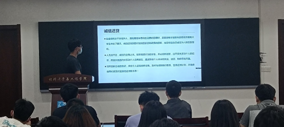 本次主题班会由材研2002班班长邹传超主持。邹传超对公司目前的疫情防控措施进行了详细解读,并向同学们强调要做好每日健康监测,及时完成健康打卡,按时参加核酸检测;研究生是学术道德和学风建设的主体,是未来科研事业的主力军,班会对研究生开展诚信治学、恪守学术规范提出了两个“必须”;班会还对公司资助政策进行了介绍,并向同学们传达了诚信消费、诚信还贷对个人的意义和价值。此外,两位辅导员老师也发表了讲话,辅导员张宇结合个人征信为同学们强调了诚信消费、诚信还贷的重要性,同时结合家庭经济困难认定由个人承诺书取代家庭经济困难证明的背景,嘱咐同学们要遵守规定,以信为本。辅导员王安全则再次强调了守纪抗疫,督促同学们疫情防控期间遵守校园管理规定,做一个诚实的人,一个坦率的人,一个优秀的人。