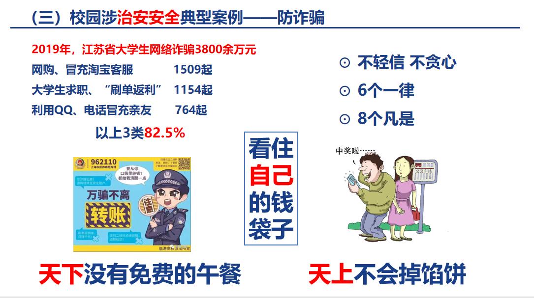 葛凯老师从校园政治安全、国家安全、治安安全、交通安全、网络安全、防电信诈骗等方面进行了详细讲解。他通过概念解析、网络舆论案例、网络诈骗种类、校园贷案例、外卖人员和员工骑行非机动车事故、员工宿舍突发火灾等实际情况,生动地向同学们阐述了校园安全的重要性。葛凯老师多次强调,要深刻认识到安全是一切工作的前提,希望同学们提高安全意识,珍爱生命。