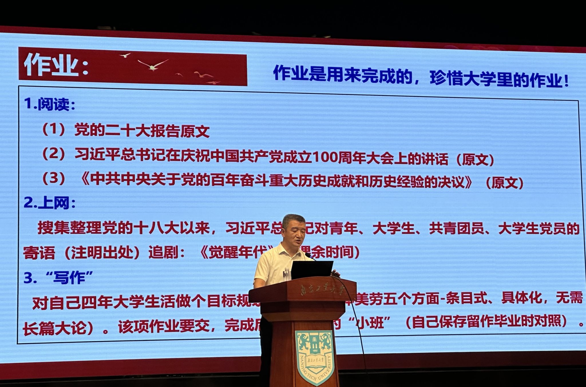 高树军书记带领新生一同回顾了党史,指明了学习党史的重要意义,希望大家在党史学习中坚定理想信念,要做到知史爱党、知史爱国。带领大家共同学习领会了党的二十大精神。他指出,同学们要牢记习近平总书记的嘱托,争做有志有识有为好青年。希望大家一是要确立“青年志四海,万里犹比邻”的远大志向,勇担使命,砥砺前进,做立志高远的新时代“有志”青年。二是要增强“不畏浮云遮望眼,自缘身在最高层”的意识,始终保持清醒头脑,坚持正确方向,做坚定不移的新时代“有识”青年。三是要坚定“路漫漫其修远兮,吾将上下而求索”的意志,将科技报国之志树于心中,在圆满完成大学阶段学业的同时,炼就担当大任本领,做实干担当的新时代“有为”青年。