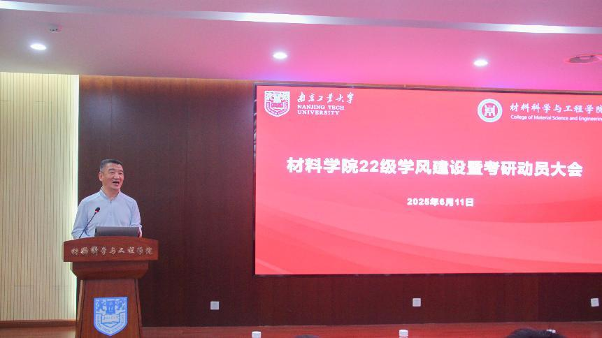 党委书记高树军以“材子报国路,奋斗正当时”为主题进行动员讲话。他首先强调了时间的紧迫性,并结合时代背景,分析了毕业生面临的机遇与挑战,并对同学们提出殷切希望。要胸怀大局,准确把握时代;要见心建信,全面认识自我;要脚踏实地,树立正确目标;要步步为营,科学制定计划;要砥砺品格,坚持自信自律;要善用方法,养成良好习惯。最后,高书记激励同学们握紧青春的力量与热忱,无论选择考研还是就业,都要展现南工大材料学子的风采,最终成就“大材”梦想。