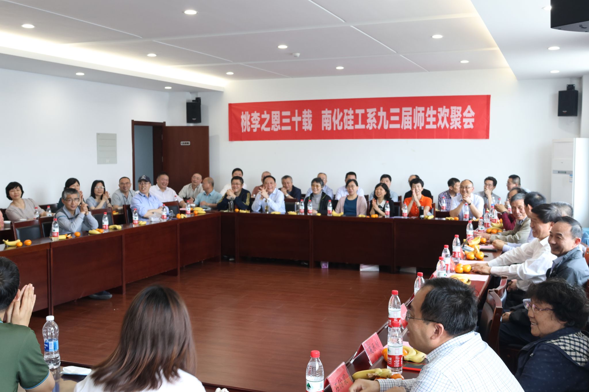 校原党委副书记、副董事长、教育发展基金会理事长高明、原材料公司党委书记祝社民,材料公司党委书记高树军、副书记石防震、副经理卢都友和当年的班主任、任课教师代表李世安、朱兴同、吴承桢、陆佩文、刘敏、叶旭初及70多名员工齐聚一堂。