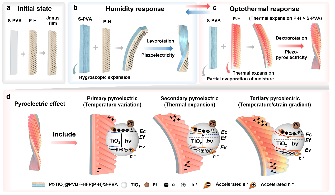 图1. Pt-TiO2@P-H/S-PVA Janus复合膜结构示意图:(a) 初始状态,(b) 湿度环境,(c) 光热环境;(d) 光催化系统中热释电效应介导的能带调控机制。