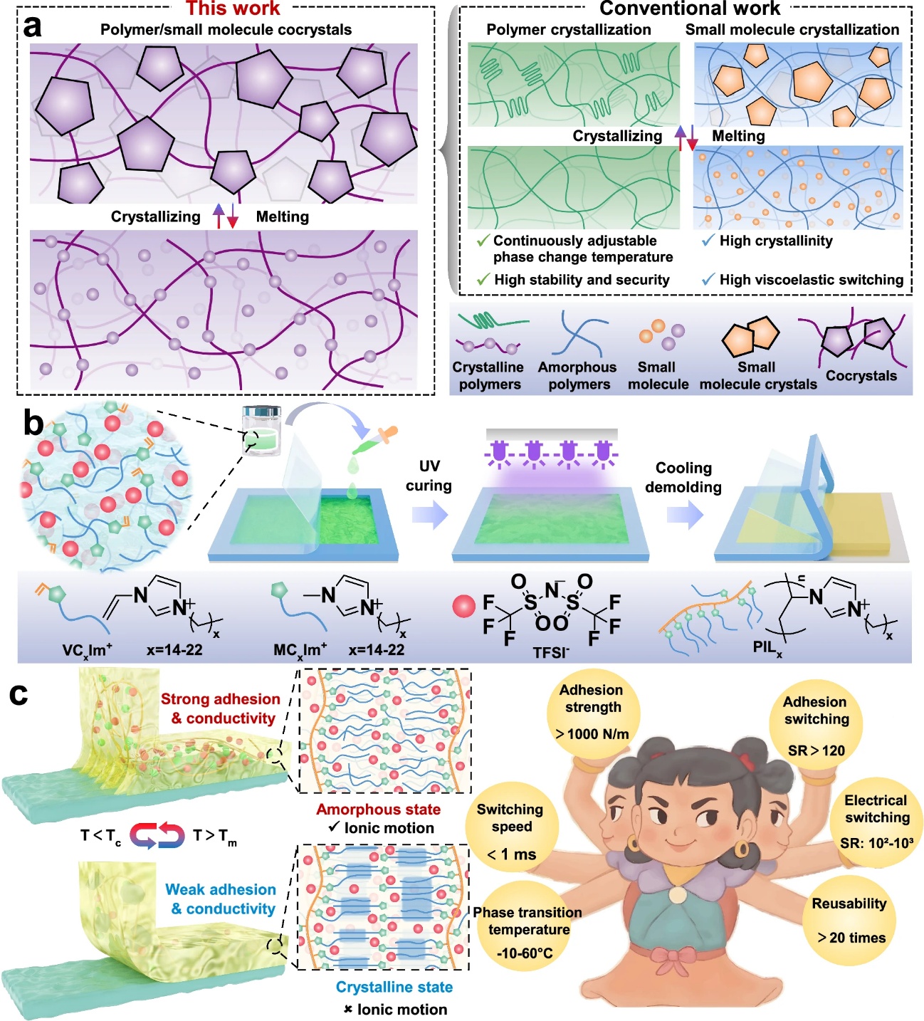 近日,公司陈双俊教授和郑严博士团队与南京大学周东山教授、王晓亮教授等人合作,在智能粘附材料领域取得显著进展,相关成果以“Cocrystal effect-driven ultrafast phase-transitionionogelfor dynamically switchable adhesion interfaces”为题发表在《Nature Communications》上。论文通讯作者为王晓亮教授、周东山教授和陈双俊教授,第一作者为郑严博士。