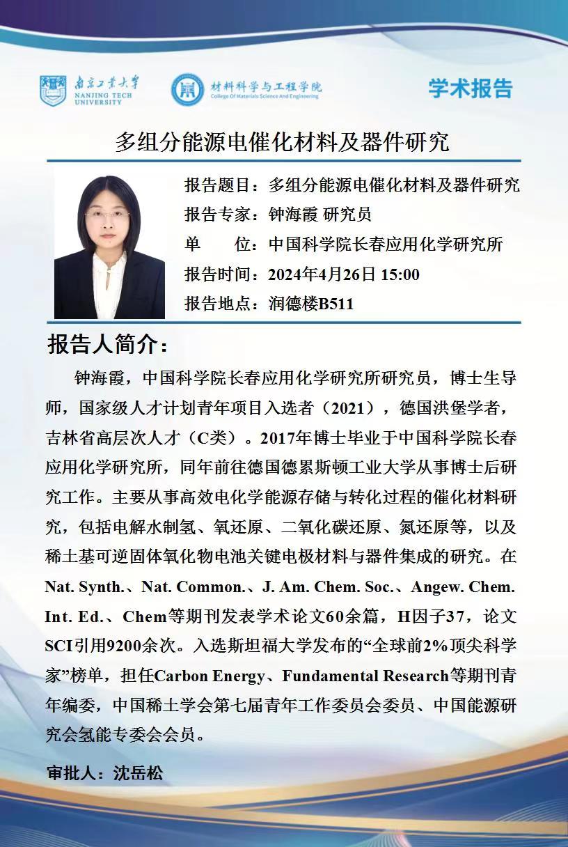 钟海霞,中国科学经理春应用化学研究所研究员,博士生导师,国家级人才计划青年项目入选者(2021),德国洪堡学者,吉林省高层次人才(C类)。2017年博士毕业于中国科学经理春应用化学研究所,同年前往德国德累斯顿工业大学从事博士后研究工作。主要从事高效电化学能源存储与转化过程的催化材料研究,包括电解水制氢、氧还原、二氧化碳还原、氮还原等,以及稀土基可逆固体氧化物电池关键电极材料与器件集成的研究。在Nat. Synth.、Nat. Common.、J. Am. Chem. Soc.、Angew. Chem. Int. Ed.、Chem等期刊发表学术论文60余篇,H因子37,论文SCI引用9200余次。入选斯坦福大学发布的“全球前2%顶尖科学家”榜单,担任Carbon Energy、Fundamental Research等期刊青年编委,中国稀土学会第七届青年工作委员会委员、中国能源研究会氢能专委会会员。