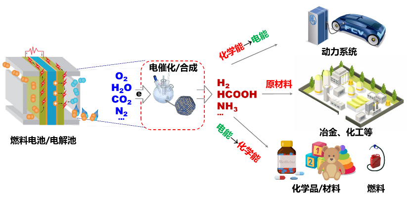 加快开发利用可再生能源是应对气候变化、保护环境和保障能源安全的重要举措。氢能技术,可开辟可再生能源存储/输运新通道,是解决可再生能源存在波动性和间隙性不足的关键和难点,在大规模可再生能源利用过程中发挥着重要作用。燃料电池与电解池技术是实现氢能高效利用与制备的核心。其中所涉及的关键反应包括氢气/氧气析出和氧气/二氧化碳还原,均存在反应动力学缓慢、选择性低、催化剂成本高/稳定性差等不足,发展高性能电催化剂可有效提升氢能利用效率。针对上述问题,常温体系中,我们致力于通过原子级精控材料组成和结构的研究策略,构建双金属单元协同催化体系,从而实现反应活性、目标产物选择性与结构稳定性协同提升。针对电催化氧还原、二氧化碳还原、氮还原体系,利用不同的功能单元协作,促进反应物/中间体吸附、反应动力学加速、表界面载流子输运加强,发展了系列高效的电催化剂。在高温体系中,我们发展了高温稀土基质子陶瓷燃料电池/电解池的关键电极材料和器件,基于稀土元素具有独特的4f5d轨道性质,通过调控材料的表面活性和电子/离子输运行为,构筑了系列高性能离子-电子混合导体特性的稀土钙钛矿电极材料,并研制了高性能电池电堆器件。