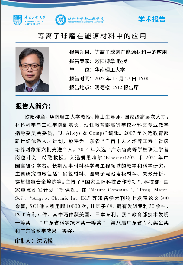 【学术报告】欧阳柳章教授学术报告会-等离子球磨在能源材料中的应用