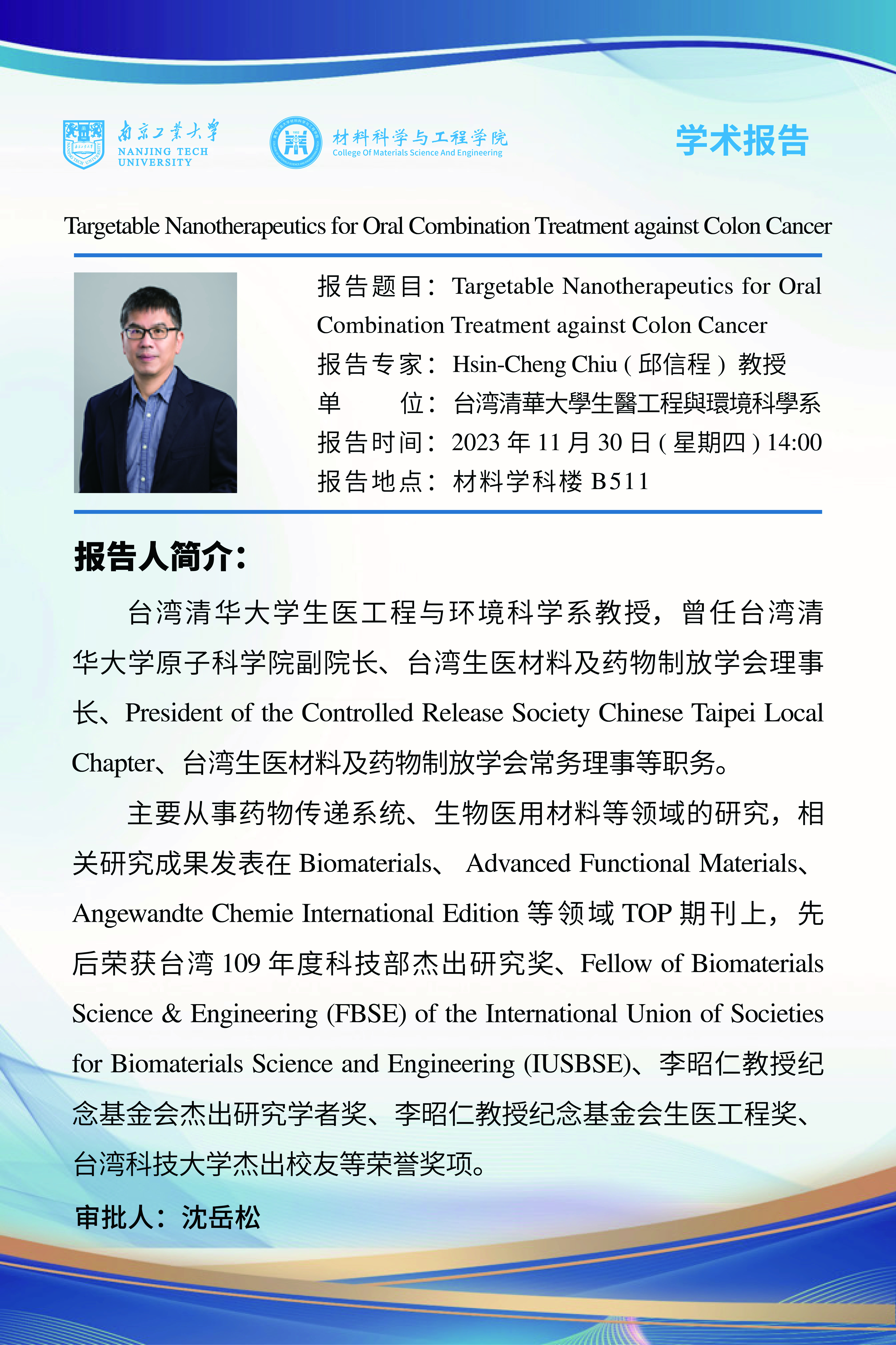 Hsin-Cheng Chiu (邱信程),台湾清华老员工医工程与环境科学系教授,曾任台湾清华大学原子科公司副经理、台湾生医材料及药物制放学会理事长、President of the Controlled Release Society Chinese Taipei Local Chapter、台湾生医材料及药物制放学会常务理事等职务。