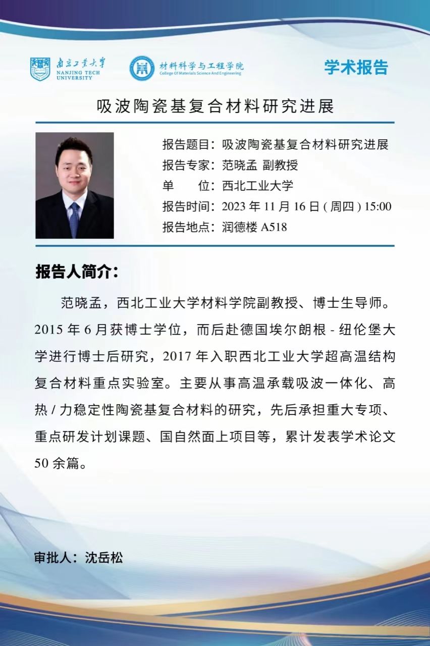 范晓孟,西北工业大学mk体育副教授、博士生导师。2015年6月获博士学位,而后赴德国埃尔朗根-纽伦堡大学进行博士后研究,2017年入职西北工业大学超高温结构复合材料重点实验室。主要从事高温承载吸波一体化、高热/力稳定性陶瓷基复合材料的研究,先后承担重大专项、重点研发计划课题、国自然面上项目等,累计发表学术论文50余篇。