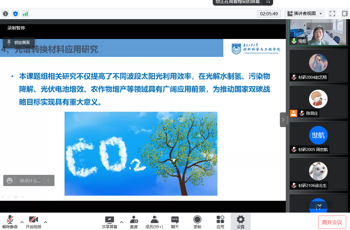 随后,倪亚茹教授作了主题为“光谱转换材料制备及其太阳光利用研究”的报告。围绕“双碳”和高效利用绿色能源的国家战略需求,以高效利用绿色太阳能为背景,介绍课题组近年来在光谱转换材料方向的研究成果;利用光谱转换材料具备的光学频段转换量子行为,提升对宽波段太阳能的吸收利用,分享光谱转换材料在太阳能电池、农用棚膜和光催化降解方面的应用。