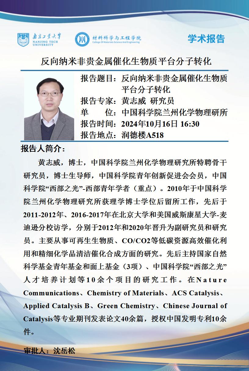 【学术报告】黄志威 研究员 学术报告会-反向纳米非贵金属催化生物质平台分子转化