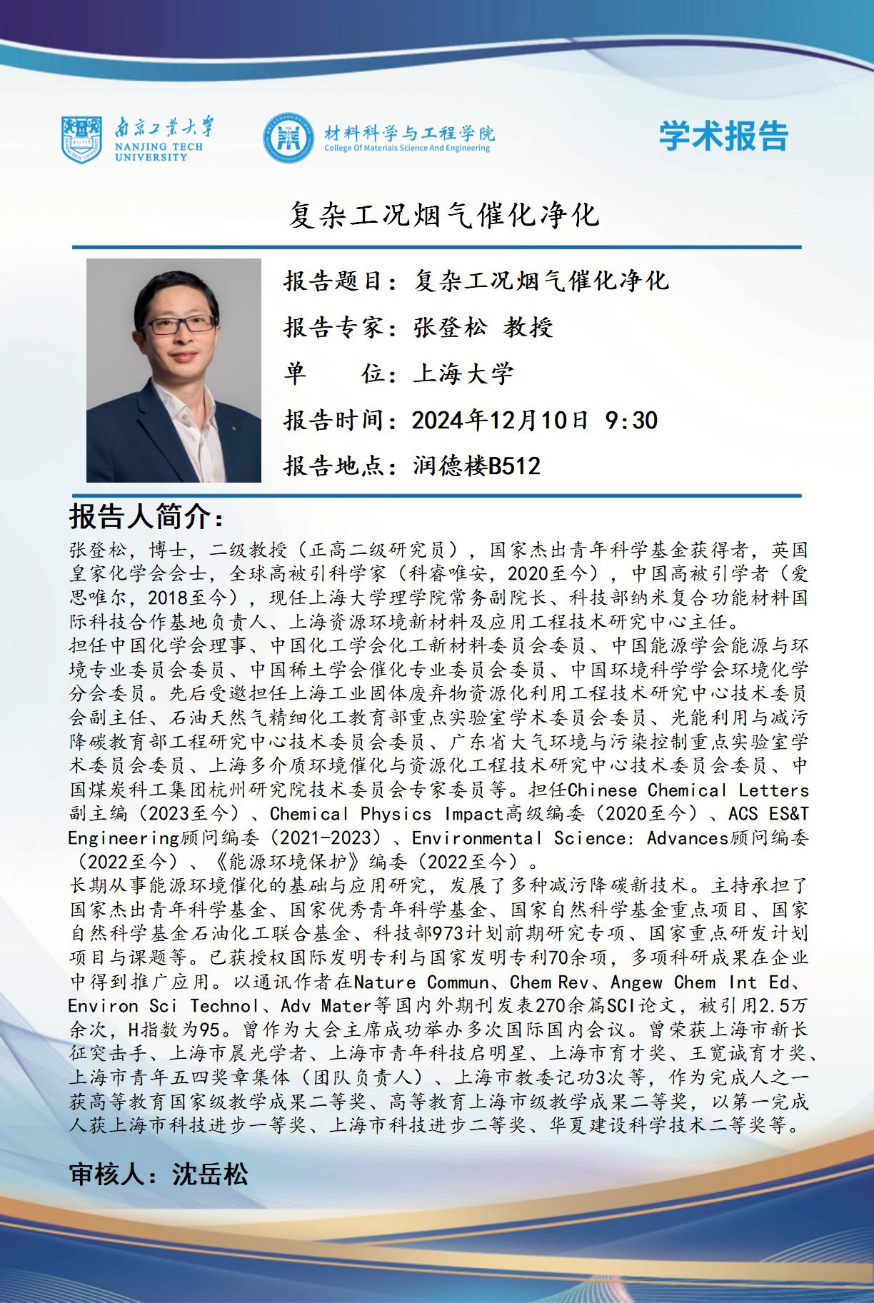 报告人简介:张登松,博士,二级教授(正高二级研究员),国家杰出青年科学基金获得者,英国皇家化学会会士,全球高被引科学家(科睿唯安,2020至今),中国高被引学者(爱思唯尔,2018至今),现任上海大学理公司常务副经理、科技部纳米复合功能材料国际科技合作基地负责人、上海资源环境新材料及应用工程技术研究中心主任。