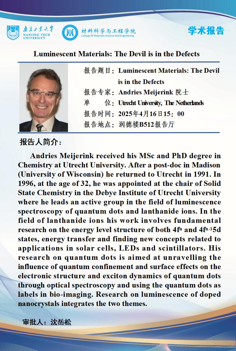 报告人简介:Andries Meijerink received his MSc and PhD degree in Chemistry at Utrecht University. After a post-doc in Madison (University of Wisconsin) he returned to Utrecht in 1991. In 1996, at the age of 32, he was appointed at the chair of Solid State Chemistry in the Debye Institute of Utrecht University where he leads an active group in the field of luminescence spectroscopy of quantum dots and lanthanide ions. In the field of lanthanide ions his work involves fundamental research on the energy level structure of both 4fn and 4fn-15d states, energy transfer and finding new concepts related to applications in solar cells, LEDs and scintillators. His research on quantum dots is aimed at unravelling the influence of quantum confinement and surface effects on the electronic structure and exciton dynamics of quantum dots through optical spectroscopy and using the quantum dots as labels in bio-imaging. Research on luminescence of doped nanocrystals integrates the two themes.