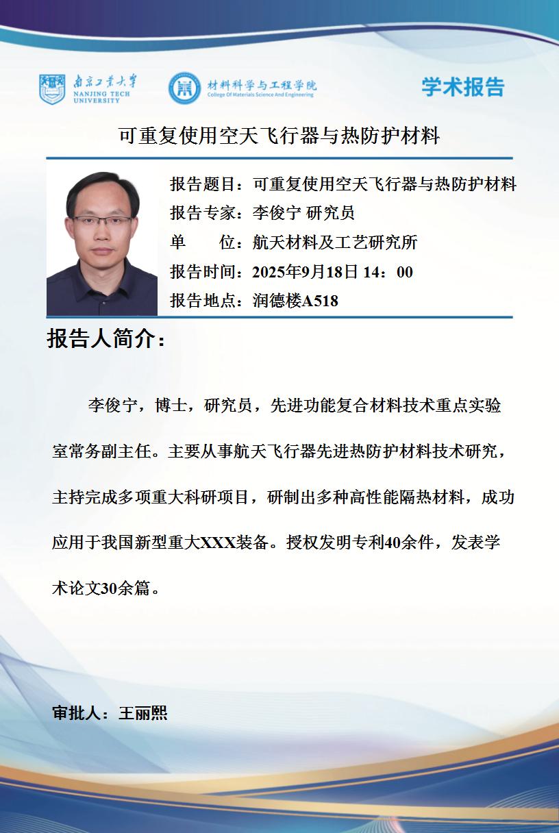 报告人简介:李俊宁,博士,研究员,先进功能复合材料技术重点实验室常务副主任。主要从事航天飞行器先进热防护材料技术研究,主持完成多项重大科研项目,研制出多种高性能隔热材料,成功应用于我国新型重大武器装备。授权发明专利40余件,发表学术论文30余篇。