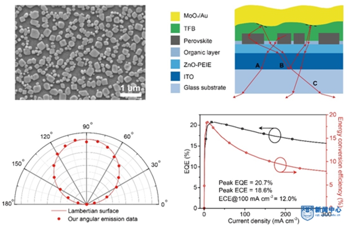 作者:海外人才缓冲基地(先进材料研究院);审核:王建浦 近日,由海外人才缓冲基地(先进材料研究院)黄维院士、王建浦教授带领的IAM团队在钙钛矿发光二极管(LED)领域再次取得重大突破。他们在世界上首次通过自发形成的具有亚微米尺度的离散型钙钛矿,使LED的光提取效率得到大幅度提升,在低成本、高亮度、大面积LED领域展现出独特的应用潜力,相关成果于10月11日发表在国际顶尖学术刊物——Nature(《自然》)上。 LED能够将电能转成光能,被称为第四代照明光源或绿色光源,在显示与照明领域应用广泛,具有广阔的市场前景以及巨大的市场价值。但是,目前平面结构的LED、尤其是有机发光二极管(OLED)的发光效率还比较低,原因在于除了约20%-30%的光子能通过折射离开器件外,其他光子都被限制在器件中,因此科学家们通常采用光提取技术来提高LED的出光效率,然而该方法需要增加图案化光栅等特殊结构,并且成本高、制备工艺复杂,往往还会造成LED发光光谱和出光方向的改变,从而影响发光效率。 针对这一世界性的重大科学难题,黄维院士、王建浦教授所带领的团队,通过一种简单的低温溶液法,实现了由一层非连续、不规则分布的钙钛矿晶粒和嵌入在钙钛矿晶粒之间的低折射率有机绝缘层组成的发光层,进而大幅度地提高了LED的光提取效率。据IAM团队学术带头人、该研究主要负责人、先进材料研究院常务副经理王建浦教授介绍,使用该方法制备的LED器件外量子效率达到20.7%,在100 mA cm-2的电流密度下能量转化效率达到12%。此外,通过与浙江大学田鹤教授、戴道锌教授团队之间的合作,他们发现该方法形成的非周期性结构可以将LED光提取效率提高10个百分点。 黄维院士指出,IAM团队作为国际上钙钛矿发光领域的开拓者之一,致力于解决钙钛矿发光器件中存在的效率和稳定性问题,继开展“钙钛矿维度调控实现高效发光”研究以来,此项研究成果再次实现了钙钛矿LED发光领域的重大突破,与目前市场上的OLED相比,所获得的器件效率大体一致,甚至在高亮度条件下的能量转化效率优于OLED,从而展现出非常广阔的应用前景。 文章链接:https://www.nature.com/articles/s41586-018-0576-2
