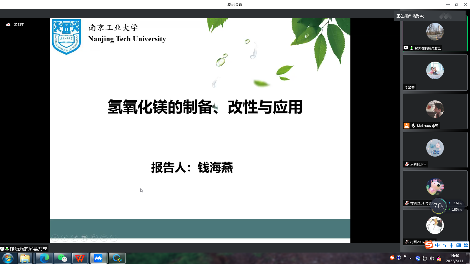 钱海燕教授作了以“氢氧化镁的制备、改性与应用”为主题的报告,系统讲解了氢氧化镁在阻燃与环保领域具有较为广泛的前景;并以课题组研究成果为例,深入浅出地介绍了氧化镁水化法制备六方片氢氧化镁及改性技术,此种方法大幅度提高PP/MH复合材料的力学性能。