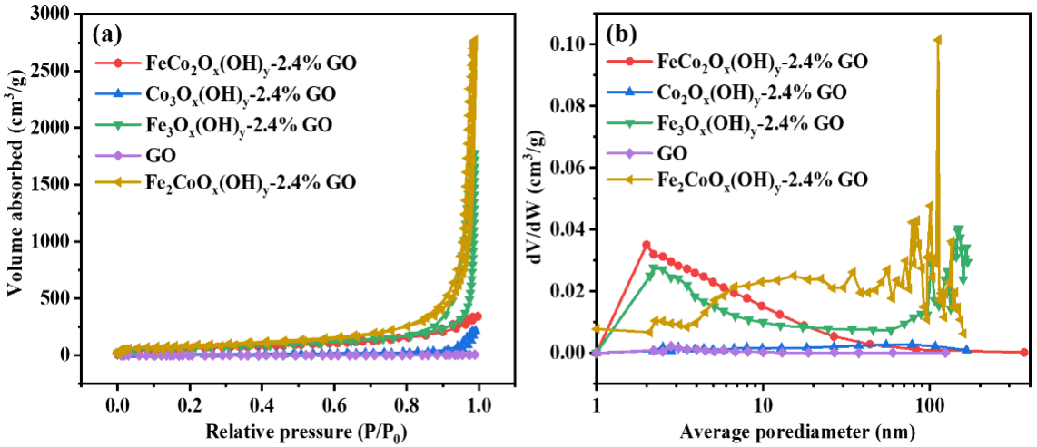 如图2(a)所示除GO外,图中的等温线都属于II型和IV型的结合体,具有H3滞后环,表明它们具备气凝胶典型的介孔三维网络结构。Fe2CoOx(OH)y-2.4%GO催化剂拥有最大的吸附量,因此,它的吸附孔体积最大,达到了4.28 cm3·g-1,而BET比表面积为324.4 m2·g-1,这主要是由大量直径大于100 nm的大孔造成的,这不利于增强OER反应活性。FeCo2Ox(OH)y-2.4%GO具有适中的吸附体积,BJH吸附孔体积为0.53 cm3·g-1,并且孔隙主要由介孔组成(图4(b)),显示出典型的气凝胶结构。Fe2CoOx(OH)y-2.4%GO的孔径分布曲线在2-170 nm范围内呈现出几个峰值,表明其具有相对宽的孔径分布范围。FeCo2Ox(OH)y-2.4%GO电催化剂的最可几分布在几纳米左右,显示出其相当均匀的中孔结构,具有单分散的峰值,且其BET比表面积高达223.52 m2·g-1。