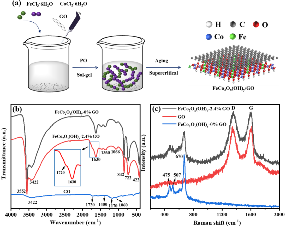 首先,FeCo2Ox(OH)y/GO电催化剂是以PO作为交联剂通过一个简单的溶胶-凝胶过程,结合超临界干燥技术合成的,如图1(a) 所示。图1(b)显示了所制备的样品的FT-IR光谱,其中1720 cm-1处的吸收谱带可归因于氧化石墨烯中C=O的伸缩振动,1060、1400和3422 cm-1的吸收峰来源于C-O伸缩振动、O-H/C-O-H伸缩振动和-OH伸缩振动。此外,1630 cm-1处的吸收峰属于C=C键的振动,422、722和842 cm-1处的吸收峰分别由Fe-O、Co-O和Fe-OH/Co-OH振动引起,而3552 cm-1处的吸收峰与Fe/Co-OH振动有关。在图1(c)中可以看见在1349和1606 cm-1处分别显示了明确的D峰和G峰,一般来说,D峰和G峰的强度比(ID/IG)被认为是评估碳基材料无序度的有效评价指标。FeCo2Ox(OH)y-2.4%GO和GO的ID/IG值相同,说明FeCo羟基氧化物的引入并没有改变GO的无序度。同时,位于670、507和475 cm-1的峰分别对应于氢氧化铁、氧化钴和氢氧化钴三种物相。