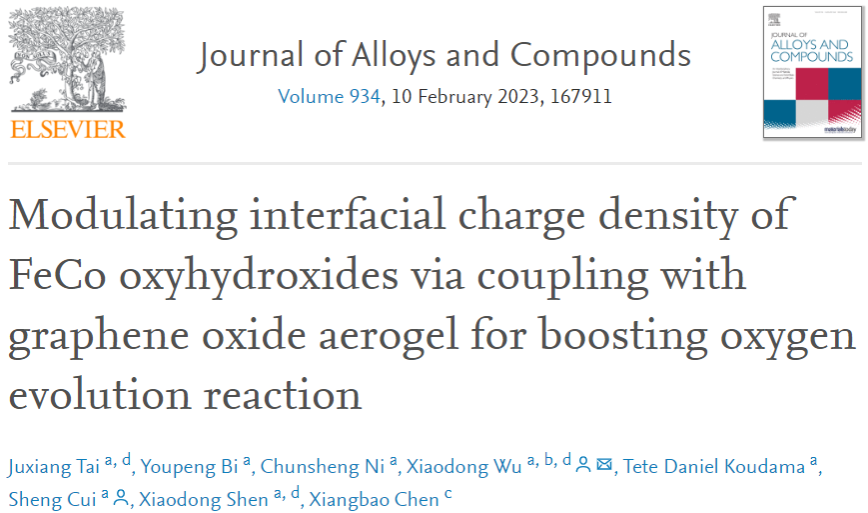 基于此,mk体育崔升教授和吴晓栋博士团队制备了一种高效的铁钴羟基氧化物负载氧化石墨烯气凝胶材料,具备优异的电催化活性及长时稳定性,并结合密度泛函理论理算(DFT)研究了其OER电催化反应机理。相关研究成果以“Modulating interfacial charge density of FeCo oxyhydroxides via coupling with graphene oxide aerogel for boosting oxygen evolution reaction”为题发表在材料科学类顶尖刊物Journal of Alloys and Compounds上。