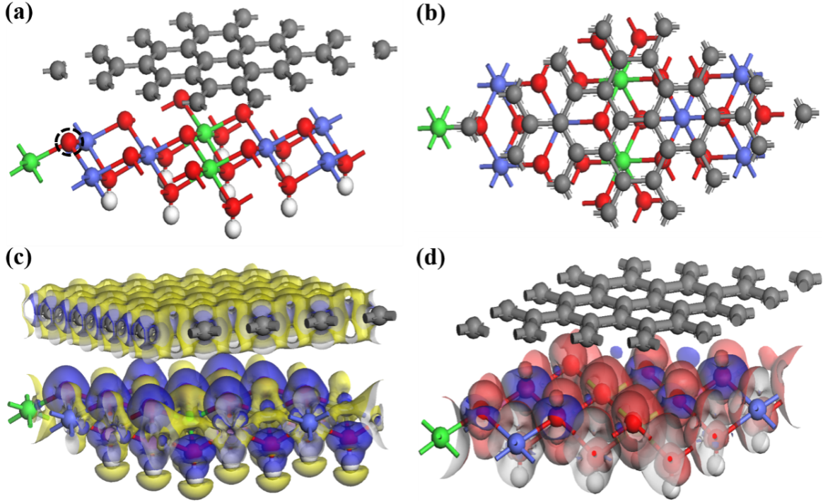图5 FeCo2Ox(OH)y/GO体系的(a)主视图,(b)俯视图(H:白色,C:灰色,O:红色,Co:蓝色,Fe:绿色),(c)差分电荷密度 (黄色:电子耗尽,蓝色:电子积累,(d)自旋密度等值面(红色:高自旋密度,蓝色:低自旋密度)