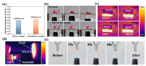 图1. (a) ZnO/SiCnw气凝胶和SiCnw气凝胶的导热性(b) ZnO/SiCnw气凝胶的耐热性能(c) ZnO/SiCnw气凝胶在290°C 的热板上30 min的红外图像(d) 5 min热稳定性测试和底部表面的红外热图像(e) ZnO/SiCnw气凝胶的垂直燃烧测试。