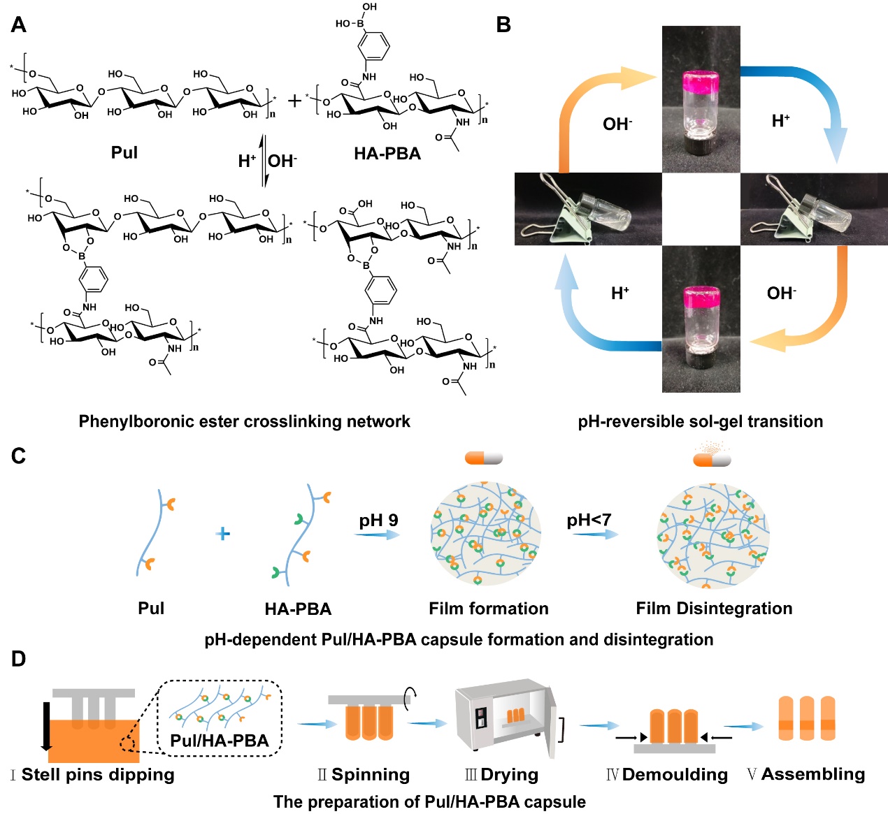 针对这一领域,mk体育何一燕教授、周廉院士与江苏力凡胶囊有限公司刘培勇高级工程师展开合作研究,成功开发了一种基于普鲁兰多糖(Pullulan)和苯硼酸功能化透明质酸(HA-PBA)的新型水溶性薄膜,用于制备快速崩解硬胶囊。该体系创新性地利用苯硼酸酯交联网络实现可逆的溶胶-凝胶转变,从而显著增强了胶囊在胃肠道环境中的快速崩解和溶解性能。实验结果表明,HA-PBA的引入赋予薄膜优异的综合性能,包括高透明度(>90%)、适宜的水接触角(68.2°)、良好的拉伸强度(71 MPa)和断裂伸长率(32.3%)。此外,该体系制备的胶囊在不同pH条件下均表现出优异的溶解性能,尤其在胃液环境中,其崩解时间显著短于传统的明胶胶囊和普鲁兰胶囊,能够实现药物的快速释放。本研究通过将苯硼酸功能化透明质酸(HA-PBA)作为胶凝剂,成功开发了具有快速崩解性能的普鲁兰-透明质酸水溶性薄膜和硬胶囊。该研究成果为制药行业提供了新型药物递送系统,在需要快速药物释放的场合具有广阔的应用前景。