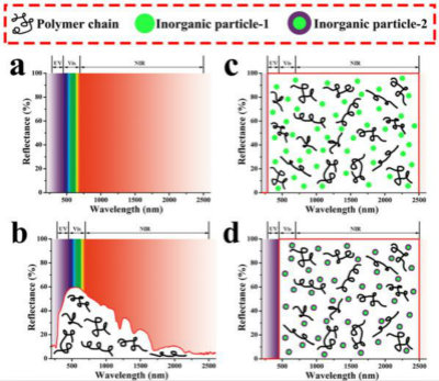 图1. 太阳能反射型ASA降温材料的理想反射图谱: (a)到达地球表面的太阳光谱, (b) 纯ASA的反射图谱, (c)理想反射型ASA-І, (d) 理想反射型ASA-П |