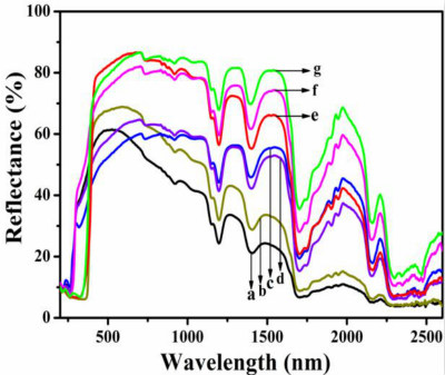 图2. ASA及其杂化材料的太阳光反射图谱: (a) 纯ASA, (b) ASA/ZnO, (c) ASA/CaMoO4, (d) ASA/Y2O3, (e) ASA/TiO2, (f) ASA/Sb2O3, (g) ASA/BaTiO3