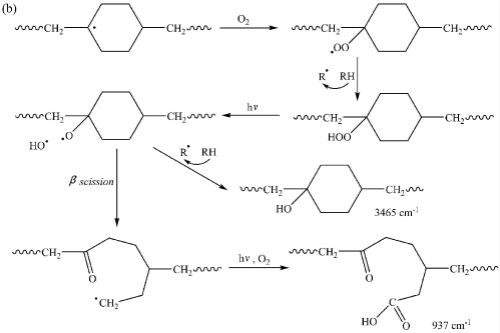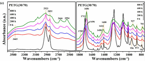近期,协同创新中心先进高分子膜材料团队张军老师课题组研究生陈婷婷等人报道了不同组成的PETG共聚酯的紫外光降解行为和机理,主要研究共聚酯中不同1,4-环己烷二甲醇(CHDM)含量对PETG紫外光降解行为与机理的影响。通过凝胶含量测定紫外光辐照后PETG的交联程度,以及通过FTIR和XPS研究紫外光辐照前后PETG表面基团的变化来推测不同组成的PETG共聚酯的紫外光降解机理,进一步根据FTIR光谱中产生的新峰来推测PETG的紫外光氧化进程。研究表明,PETG共聚酯的光氧化速率随着CHDM含量的增加而增加,即PETG固有的光稳定性随着CHDM含量的增加而下降。不同组成的PETG共聚酯表现出相似的紫外光降解机理,且CHDM的存在会促进光氧化产物的生成。在辐照过程中形成的交联产物不会被进一步氧化,且CHDM含量越高,交联程度越大。该工作近期发表在RSC Advances上(DOI: 10.1039/C6RA21985C)。