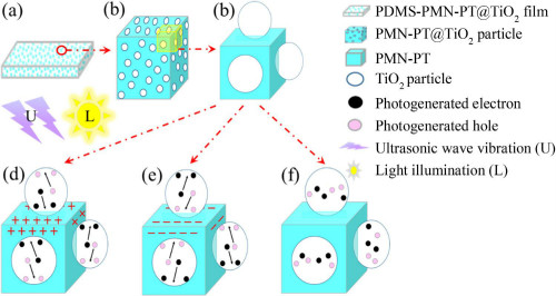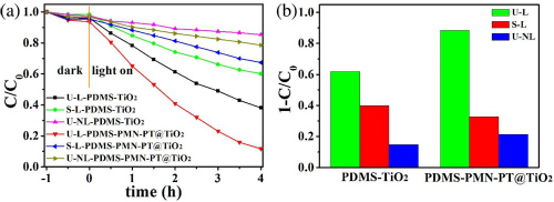 继空间交变电场促进光生载流子分离,增强PMN-PT@TiO2粉体光催化性能后,光电功能课题组进一步解决光催粉体在使用过程中不易回收利用,容易对环境造成二次污染的问题。选择具有优异的物理和化学稳定性的聚二甲基硅氧烷作为光催化剂粉体的基体,制备了压电-光催化复合薄膜PDMS-PMN-PT@TiO2。该复合结构的设计思路是利用压电功能体PMN-PT捕获机械能产生交变空间电场促进TiO2光生载流子分离,提高光催化效率;而PDMS则作为基体材料解决催化剂粉体在实际应用过程中出现的回收利用困难的问题,避免向环境中引入污染。详细内容可参见Applied Surface Science 403 (2017) 9–14。
