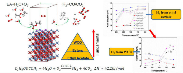 江苏先进无机功能复合材料协同创新中心新型绿色催化材料团队利用新型的Ni3La7Oy/Al2O3催化剂,以乙酸乙酯和地沟油为氢源,对地沟油催化重整制氢技术进行深入系统的研究。发现Ni/La摩尔比,反应温度,焙烧温度和表面酸碱性对重整催化性能有重要影响。其中,在700℃制备的Ni3La7Oy/Al2O3催化剂在催化反应温度区间(700-800℃)具有最佳的催化效果:87%的H2选择性,62%的CO选择性,32%的CO2选择性,低CH4选择性,94.49%碳平衡和高稳定性。结果表明,催化剂低的酸性可以促进重整反应进行。该实验也验证了地沟油在Ni3La7Oy/Al2O3催化剂体系自热重整制氢的可行性。此外,作者通过计算模拟讨论了乙酸乙酯自热重整制氢反应的机理。该成果发表在Energy Conversion and Management期刊上。
