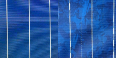 图1 左):采用我中心新型制绒技术生产的金刚线多晶硅电池片外观;右):传统工艺生产的金刚线多晶硅电池片外观