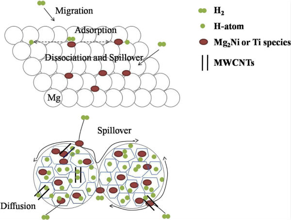 本中心氢能源材料研究团队最近报道了多壁碳纳米管载镍和TiF3对镁基氢化物储氢性能的影响。该研究表明,采用氢化燃烧合成(Hydriding Combustion Synthesis,HCS)与机械球磨(Mechanical Milling,MM)复合制备技术(HCS+MM),大大改善了镁基储氢材料的吸放氢性能,Mg85-(Ni/MWCNTs)15体系表现出最好的性能,该体系可在373 K,100 s内吸收5.68 wt%的氢,并且在523 K,1800 s内放氢量可达4.31 wt%。添加TiF3可使该体系吸放氢性能得到进一步的提升。材料中原位生成的纳米Mg2Ni颗粒、多壁碳纳米管和TiF3协同作用,显著促进了镁基氢化物的吸放氢性能。该项工作近期发表在Journal of Alloys and Compounds, 2016, 669: 8-18期刊上。